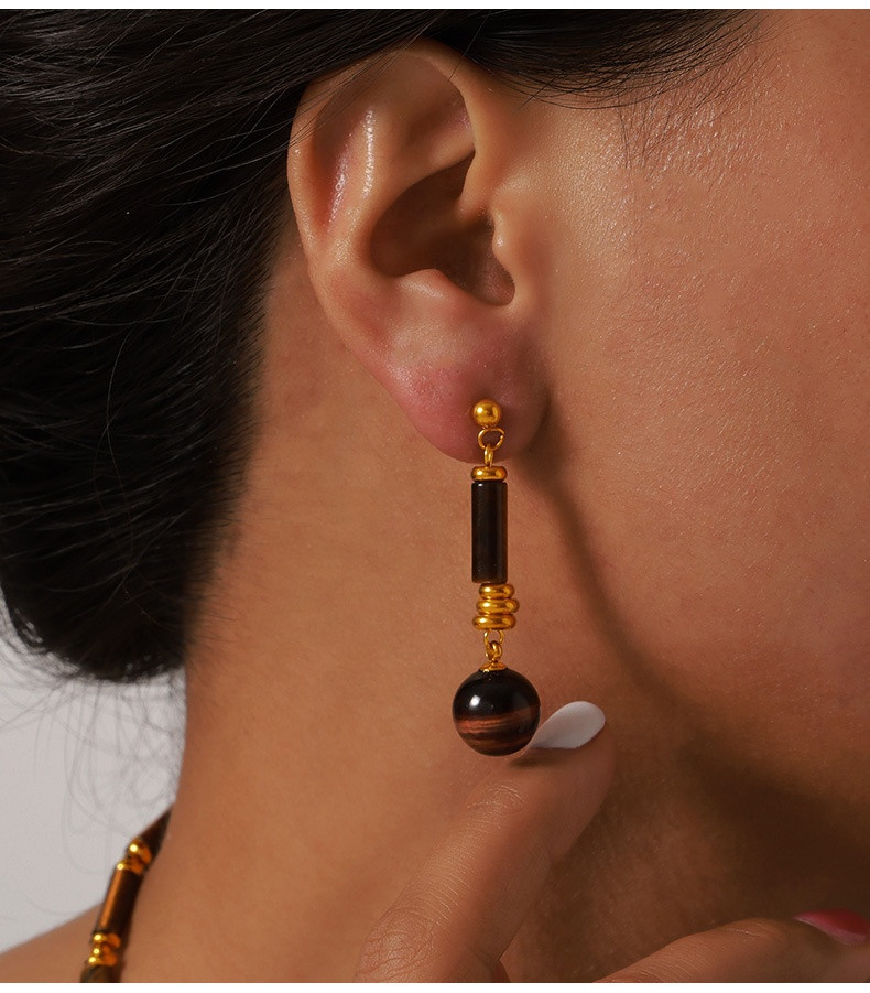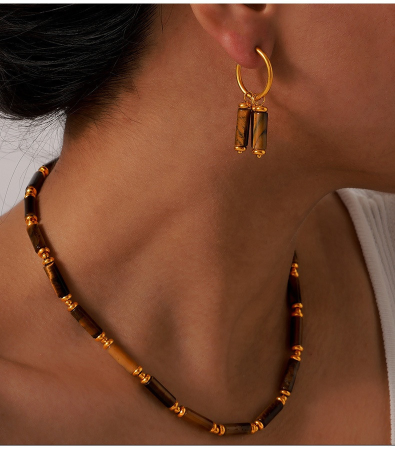Ensemble collier et boucles d'oreilles en acier inoxydable, style Maillard rétro, tempérament élégant, bijoux de niche, design de perles en œil de tigre